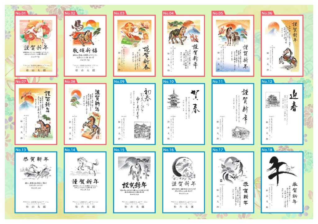 郷土愛媛を感じさせる絵柄やさまざまな干支のイラスト、いろいろな賀詞・文例を取り揃えております。